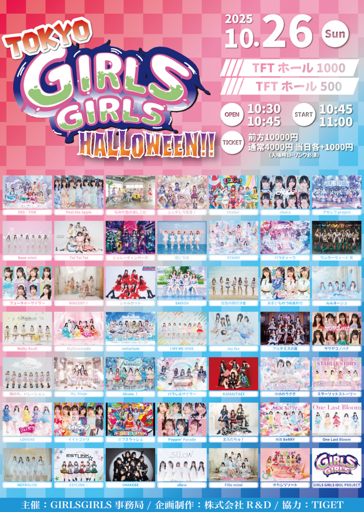 TOKYO GIRLS GIRLS Halloween!! SCHEDULE 2025/10/26(日) 10:30 - 10/26(日) TFTホール1000 TOKYO GIRLS GIRLS Halloween!! OP 10:30 / ST 10:45 ライブ 18:20-18:45 特典会 18:55-20:15 C 入場特典🧸サインありチェキ券 チケットはこちら☑️ https://tiget.net/events/435372 URLをコピーする 報告する