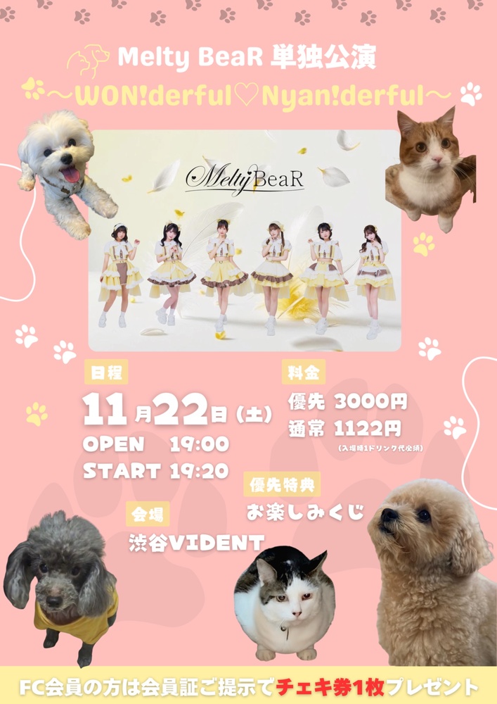 Melty BeaR単独公演 〜WON!derful♡Nyan!derful〜 SCHEDULE 2025/11/22(土) 19:00 - 11/22(土) 渋谷VIDENT Melty BeaR単独公演 〜WON!derful♡Nyan!derful〜 OP 19:00 / ST 19:20 優先特典:お楽しみくじ FC先行受付中☑️ https://t-dv.com/WONNyan_MBR2025 URLをコピーする 報告する