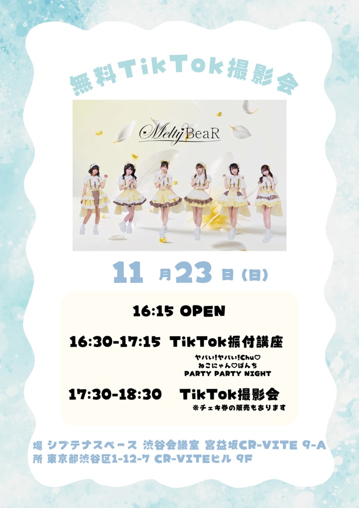 TikTok無料撮影会 SCHEDULE 2025/11/23(日) 16:15 - 11/23(日) シブテナスペース 渋谷会議室 宮益坂CR VITEビル 9F ✨入場無料✨ 🆓TikTok撮影無料🆓 たくさん踊って撮影しましょう🧏🏻♂️🌟 URLをコピーする 報告する