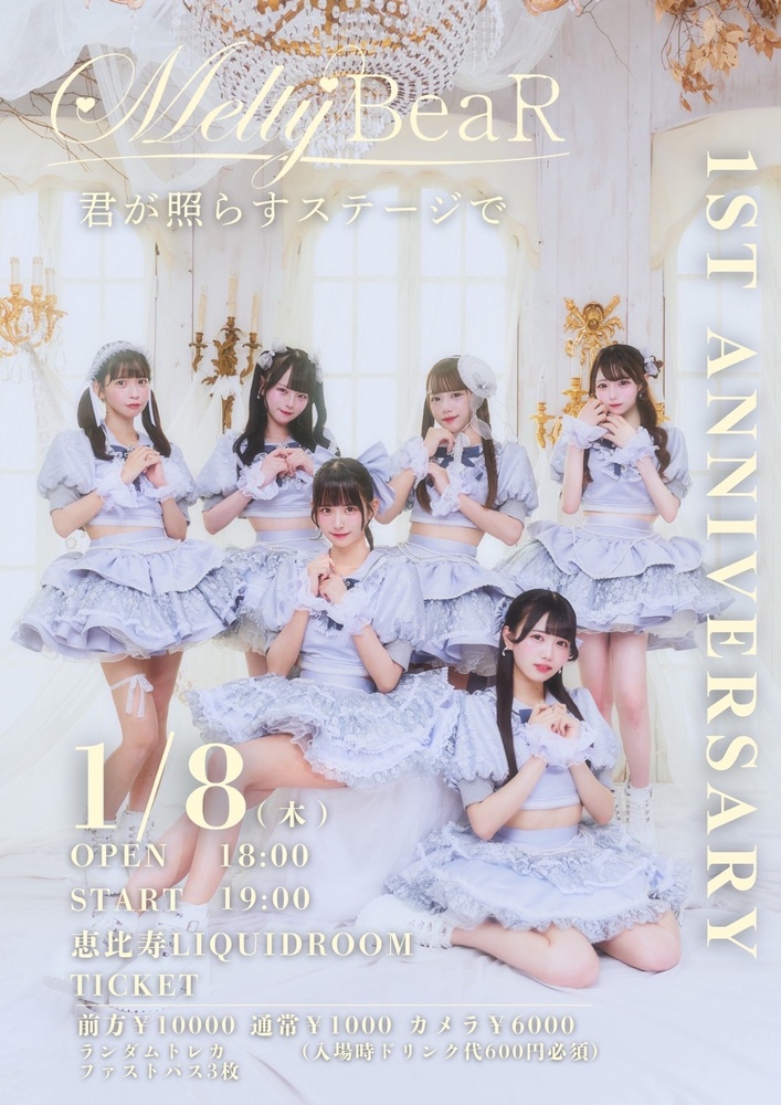 Melty BeaR 1st Anniversary ONEMAN LIVE 〜君が照らす ステージで〜 SCHEDULE 2026/01/08(木) 18:00 - 1/8(木) 恵比寿LIQUIDROOM Melty BeaR 1st Anniversary ONEMAN LIVE ~君が照らす ステージで~ OP 18:00 / ST 19:00 FC抽選受付開始☑️ https://t-dv.com/1stAnniversaryoneman_MBR URLをコピーする 報告する
