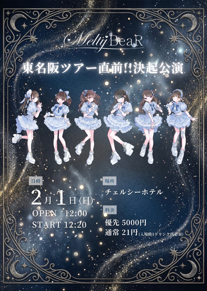 東名阪ツアー直前決起公演 SCHEDULE 2026/02/01(日) 2/1(日) チェルシーホテル 東名阪ツアー直前決起公演 OPEN 12:00 START 12:20 優先特典 お楽しみくじ FC先行受付中☑️ https://t-dv.com/20260201_MBR 先行抽選 1/10(土)22:00〜 一般販売 1/13(月)22:00〜 URLをコピーする 報告する