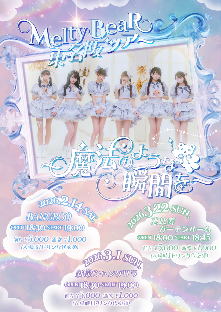 Melty BeaR 東名阪ツアー 〜魔法のような瞬間を in大阪〜 SCHEDULE 2026/02/14(土) 14:17 - 20:00 2/14 (土)大阪 BANGBOO Melty BeaR 東名阪ツアー 〜魔法のような瞬間を〜 OPEN 18:30 START 19:00 チケットはこちら☑️ https://t-dv.com/2026TMHtour_MBR URLをコピーする 報告する